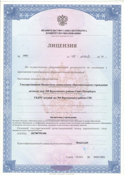 Полное наименование образовательной организации* ГОСУДАРСТВЕННОЕ БЮДЖЕТНОЕ ДОШКОЛЬНОЕ ОБРАЗОВАТЕЛЬНОЕ УЧРЕЖДЕНИЕ ДЕТСКИЙ САД № 8 ФРУНЗЕНСКОГО РАЙОНА САНКТ-ПЕТЕРБУРГА